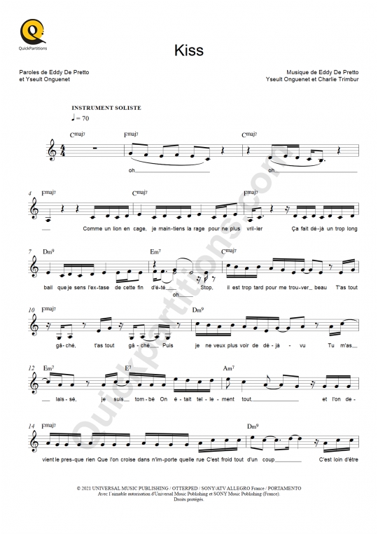 This score is suitable for singers and for solo instruments such as Flute, Trumpet, Saxophone or Clarinet. After purchase, you will be able to print the transposition of your choice in order to adapt the score to your vocal range or your instrument (particularly for E flat or B flat key).