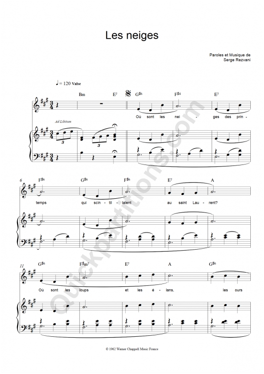 Les neiges© 1962 Warner Chappell Music FranceParoles et Musique deSerge RezvaniLes neigesBmE7G#6sontlesneiF#4gesE7-desprin-q = 120 ValsetempsF#6quiG#6scintil-laientF#6-auE7saintLaurent?A-6G#6sontlesloupsF#m7etE7lesélans,A-G#6lesours11343434Ad Libitum33Quickpartitions.com