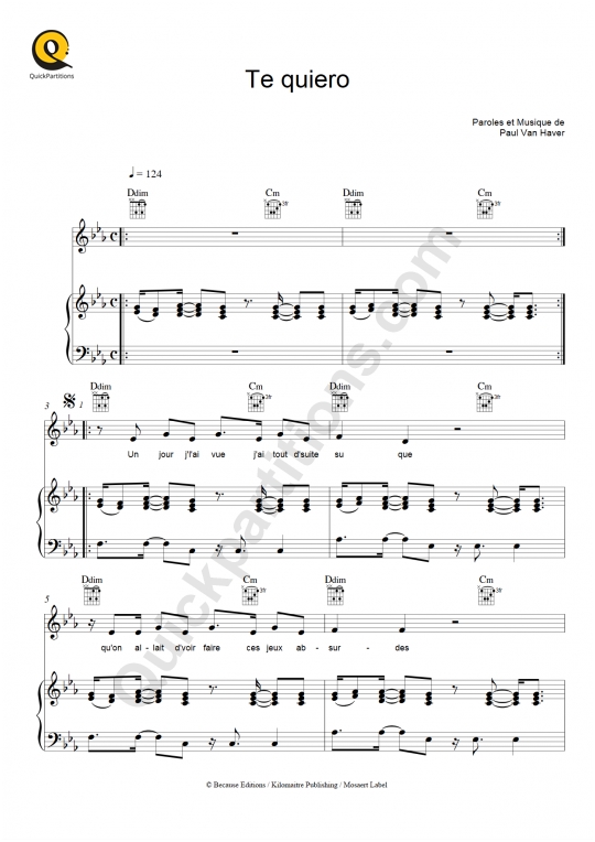 Te quiero © Because Editions / Kilomaitre Publishing / Mosaert Label Paroles et Musique dePaul Van HaverTe quieroD‡…‹3frC‹D‡…‹3frC‹q = 124D‡…‹Unjourj'l'aivuej'ai3frC‹toutd'suitesuD‡…‹que3frC‹3D‡…‹qu'onallait-d'voirfaireces3frC‹jeuxabsurD‡…‹-des-3frC‹5ccc1Quickpartitions.com