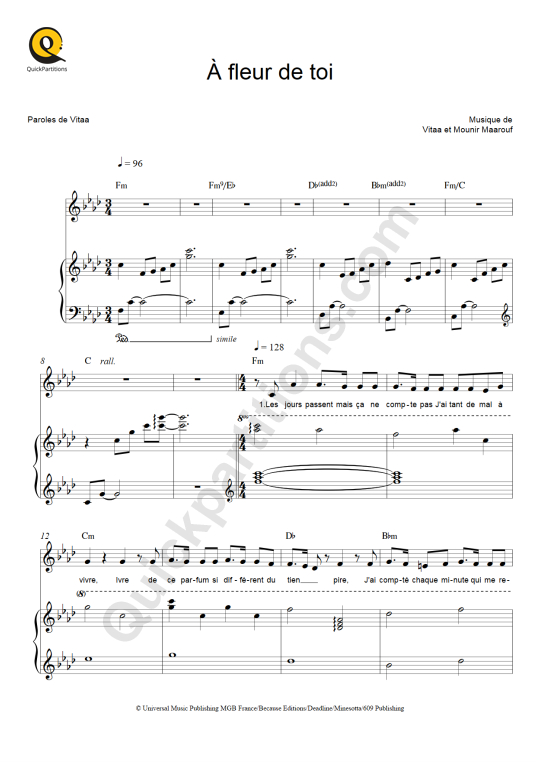 À fleur de toi © Universal Music Publishing MGB France/Because Editions/Deadline/Minesotta/609 PublishingParoles de VitaaMusique deVitaa et Mounir MaaroufÀ fleur de toiF‹F‹9/E¨D¨(„ˆˆ2)B¨‹(„ˆˆ2)F‹/Cq = 96CF‹1.Lesjourspassentmaisçanecompte-pasJ'aitantdemalàrall.q = 1288vivre,C‹Ivredeceparfum-sidif-rent-dutienpire,J'aicompB¨‹-chaqueminute-quimere-12343434444444simileQuickpartitions.com