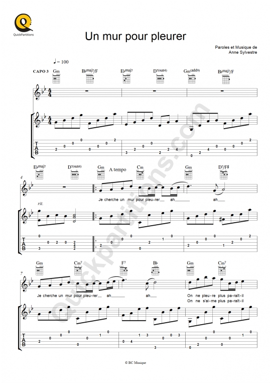 Avec un simple arpège à la guitare, Un mur pour pleurer est une chanson à la fois sobre et touchante. Découvrez notre tablature du titre. En plaçant un capodastre en troisième case vous pourrez l'interpréter dans la même tonalité qu'Anne Sylvestre. C'est à vous de jouer !