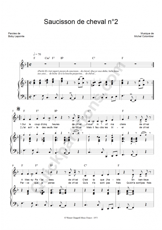 Saucisson de cheval n°2Paroles deBoby Lapointe© Warner Chappell Music France - 1975Musique deMichel ColombierSaucisson de cheval n°2FCm7F7BbC7Fh = 701.Sur2.J'aiFleach'coupF7-d'cinqdesoeufsheureshierBbdedech'valch'valJ'vousMaisC7ilfauindra-vit'les-matrichèreerF-dedech'valch'val5AParFMasce-sy-PaqueF7laije-seaupenseBb-dedech'valch'valC'estQu'aC7n'aquesontj'hapasbitefraisF-Qu'a'n'aEnbansont'paslieue-frais9CCC(Parlé) Et c'est reparti encore du saucisson... de cheval, Que je vous dédie, belle dameaux yeux... de biche Et à la bouche purpurine... de cheval...Quickpartitions.com
