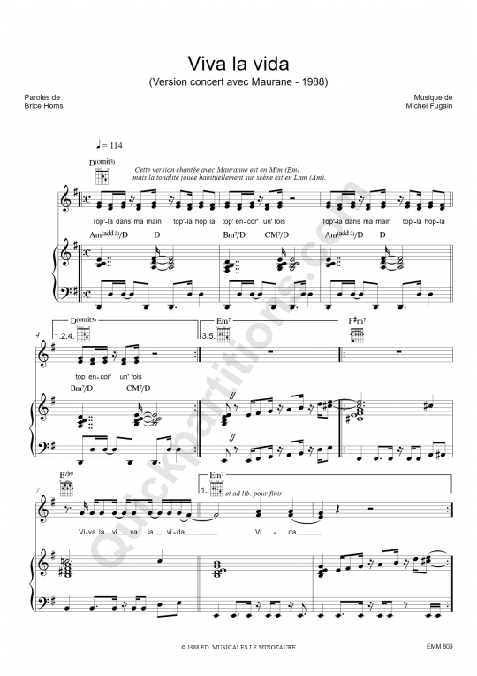 Viva la vida1.2.4.3.5.1.Paroles deBrice Homs© 1988 ED. MUSICALES LE MINOTAUREViva la vidaMusique deMichel FugainTop'D(;3)-dansmamaintop'-hoptop'encor'-un'foisTop'-dansmamaintop'-hop-q = 114Am(' 2)/DDBm7/DCM7/DAm(' 2)/DDtopD(;3)encor'-un'foisEm7F#m74Bm7/DCM7/DB7b9Viva-lavivalavida-Em7Vida-7ccc Cette version chantée avec Mauranne est en Mim (Em)mais la tonalité jouée habituellement sur scène est en Lam (Am).(Version concert avec Maurane - 1988)et ad lib. pour finirEMM 809Quickpartitions.com