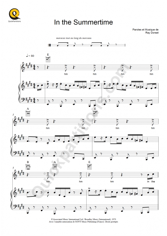 In the Summertime In the SummertimeParoles et Musique deRay Dorset© Associated Music International Ltd / Broadley Music (International), 1970Avec l’aimable autorisation de SONY Music Publishing (France). Droits protégésEhmhmhmhmq = 80AhmhmEhmhm3BhmAhmEhmInthe5444444maracas tout au long du morceau Quickpartitions.com