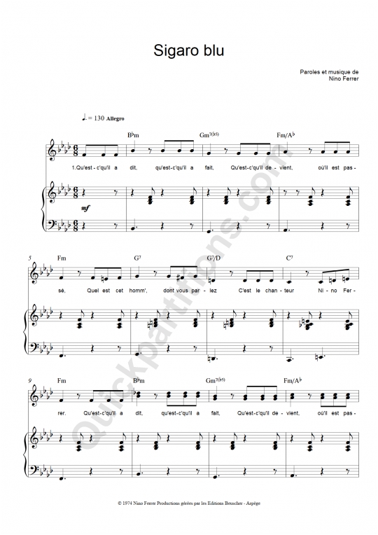 Sigaro bluSigaro blu© 1974 Nino Ferrer Productions gérées par les Editions Beuscher - ArpègeParoles et musique deNino Ferrer1.Qu'estc'qu'il-adit,Bbmqu'estc'qu'il-afait,Gm7(b5)Qu'estc'qu'il-devient,Fm/Ab-où'ilestpas-q. = 130 Allegromfsé,FmQuelestcethomm',G7dontvousparlezG7/D-C'estlechanteurC7-Nino-Fer-5rer.FmQu'estc'qu'il-adit,Bbmqu'estc'qu'il-afait,Gm7(b5)Qu'estc'qu'il-devient,Fm/Ab-où'ilestpas-9686868Quickpartitions.com