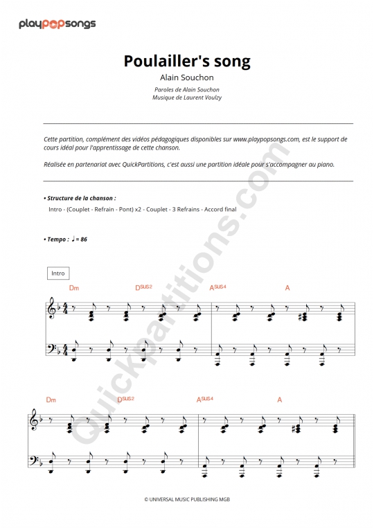 Poulailler's songq = 86Alain Souchon• Tempo :Intro - (Couplet - Refrain - Pont) x2 - Couplet - 3 Refrains - Accord finalCette partition, complément des vidéos pédagogiques disponibles sur www.playpopsongs.com, est le support decours idéal pour l'apprentissage de cette chanson.Réalisée en partenariat avec QuickPartitions, c'est aussi une partition idéale pour s'accompagner au piano.• Structure de la chanson :Poulailler's song______________________________________________________________________________________________________________________________________________________________________________________________________________________________________________________________© Editions Alain SouchonParoles de Alain SouchonMusique de Laurent VoulzyD‹D“2A“4AD‹D“2A“4A4444IntroQuickpartitions.com