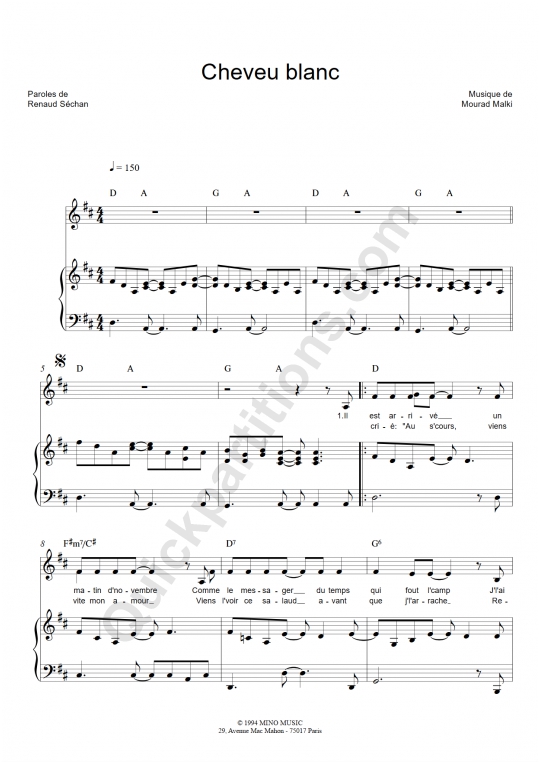 Cheveu blancParoles deRenaud SéchanCheveu blanc© 1994 MINO MUSIC29, Avenue Mac Mahon - 75017 ParisMusique deMourad MalkiDAGADAGAq = 150DAGA1.IlestcriDaré:-ri"Au-s'cours,-unviens5maviteF#m7/C#tinmon-d'noavembremour--CommeVienslel'voirD7mescesasa-gerlaud--duatempsvant-quiqueG6foutj'l'arl'camprache-J'l'aiRe-8444444Quickpartitions.com