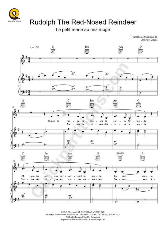 Voici notre partition du célèbre thème Le petit renne au nez rouge ! Ce chant de Noël inspiré d'un poème de Robert May a d'abord été mis en musique par Johnny Marks sous le titre Rudolph The Red-Nosed Reindeer avant d'être traduit en plusieurs langues. L'adaptation française est écrite par Jacques Larue. De très nombreux artistes ont repris cette jolie chanson sur des albums de Noël. Pour réaliser notre relevé, nous avons choisi de suivre l'accompagnement au piano de la version chantée par Renée Martel. Nous espérons qu'elle sera un support agréable pour vous permettre de chanter en famille durant la période des fêtes !