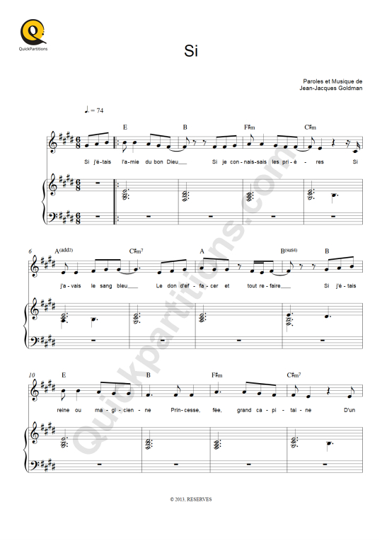 Vous aurez sans doute reconnu le style inimitable de Jean-Jacques Goldman derrière cette ballade au piano ! Un titre écrit pour Zaz et qui figure sur son second album Recto Verso paru en 2013. Si les quatre dièses à la clé vous paraissent difficiles à aborder n'hésitez pas à demander une transposition dans une autre tonalité ;) C'est à vous de jouer avec la partition pour piano du titre Si.